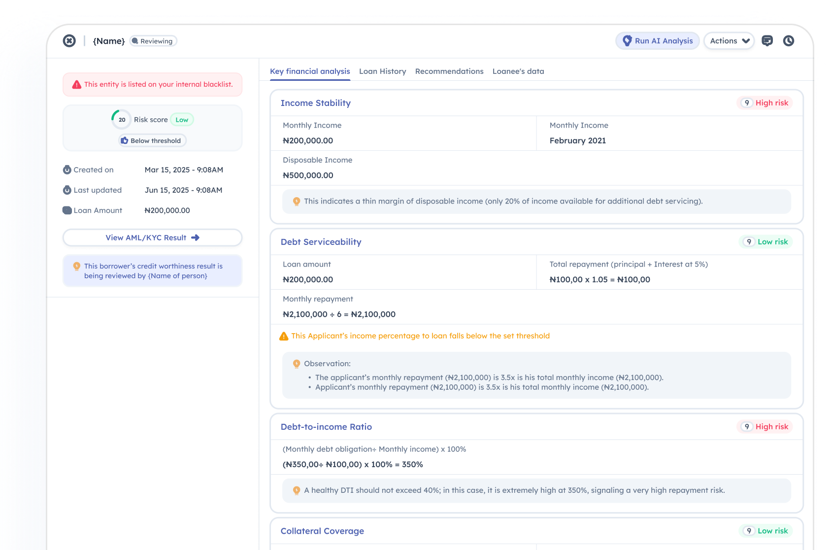 Analyze key financial indicators such as credit score, debt levels, and payment history to generate data-driven recommendations for confident lending decisions.